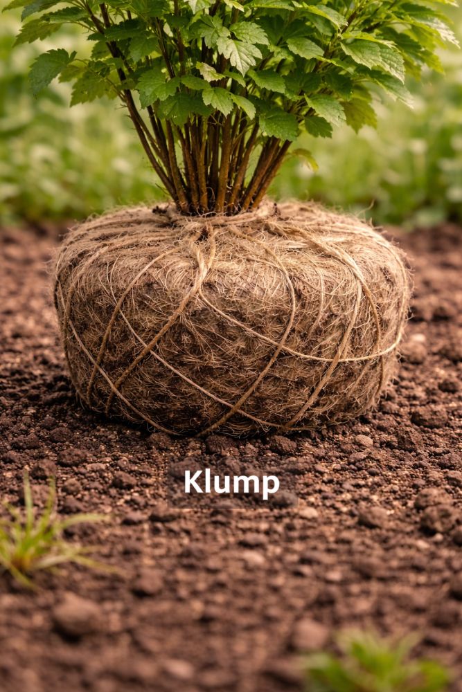 Klump betyder, at rødderne er samlet i en fast jordklump, som holder sammen omkring planten.